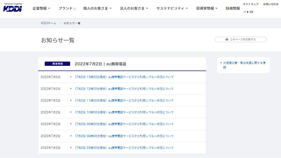 大規模通信障害が2022年07月02日01時35分より発生しております。(※1)