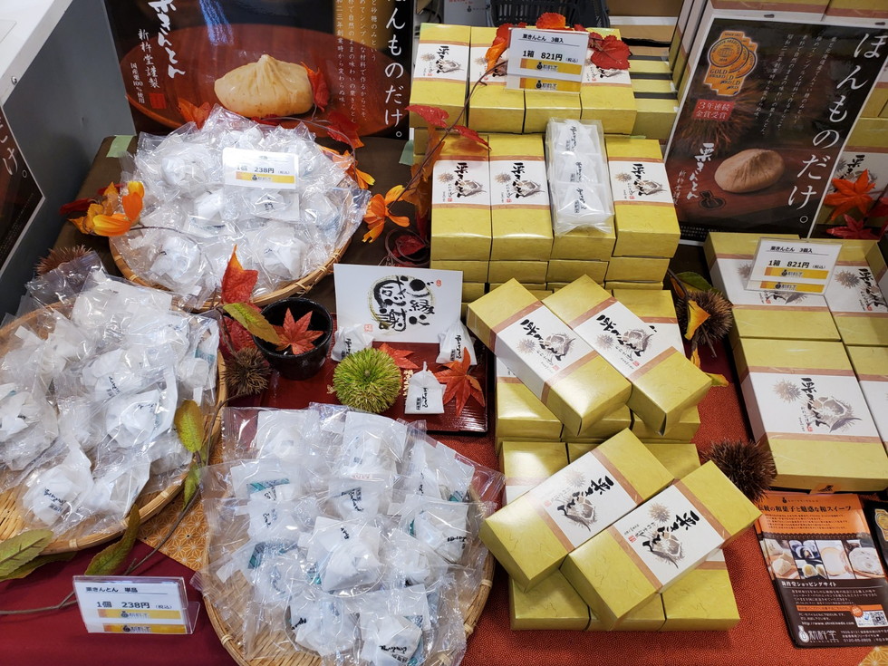 新杵堂の定番人気商品の「栗きんとん」「鳴門金時栗きんとん」「羽二重餅入栗きんとん」「まるごとみかん大福」「まるごと渋皮栗大福」を今回ご用意いたします。箱入りの商品もご用意いたしておりますので、ぜひお立ち寄りください。